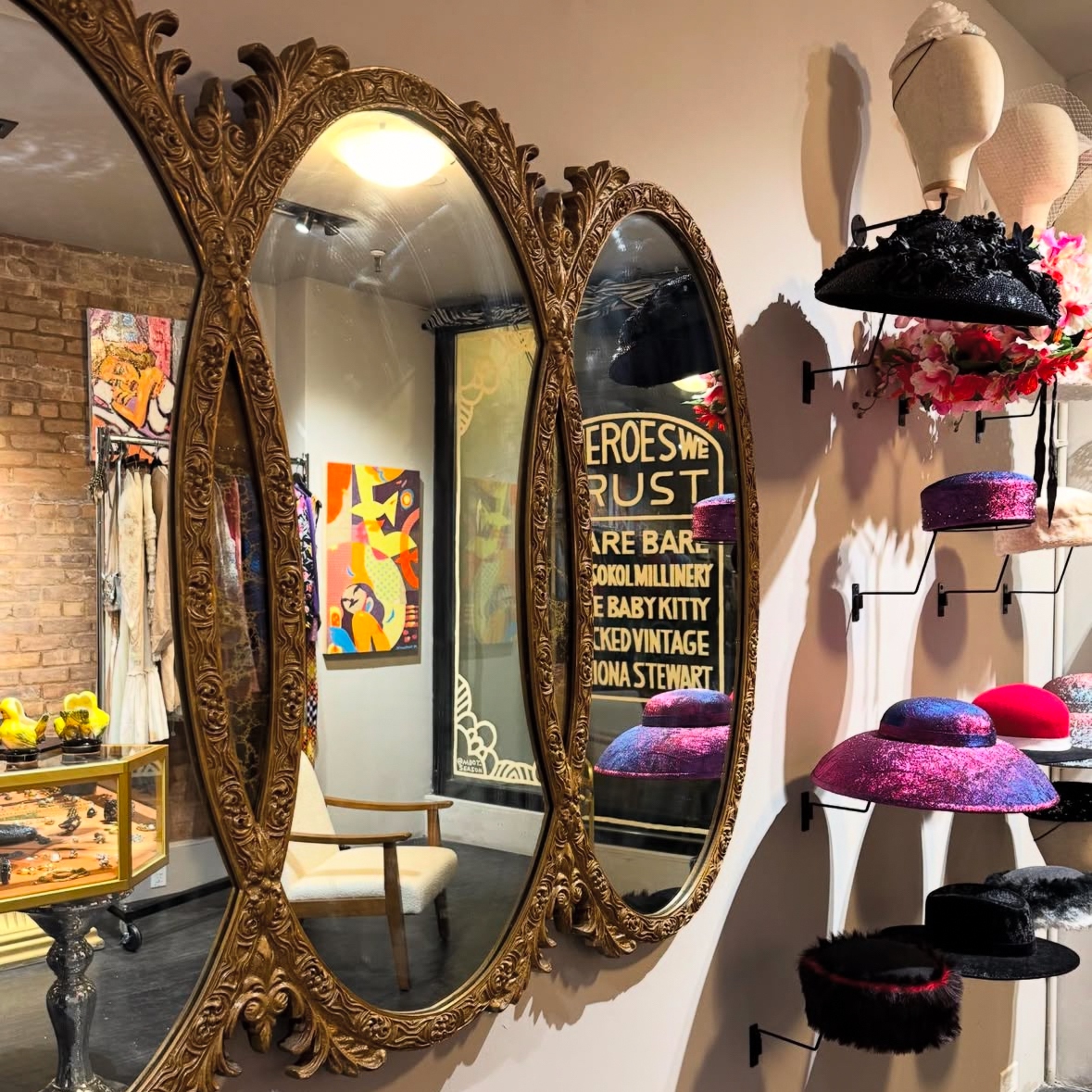 The collaborative pop-up showcases the works of six talented designers and artists including, Neely Shearer, Clare Herron, Sarah Sokol, Erin Powell, Catriona Stewart, and Laura Ellner. Neely Shearer curates vintage, reworked, and new garments from designers, art from local and international artists, and her own designs. A co-owner of Hidden Gem, Clare Herron creates lingerie from upcycled vintage and eco-conscious materials, handmade by her team in LA and Hudson, NY. Sarah Sokol is a couture milliner, crafting one-of-a-kind hats and headpieces for icons such as Beyoncé and Janelle Monáe. Erin Powell makes unique garments from carefully sourced vintage textiles where each piece is reimagined, reflecting the history, place, and craft of the fabric. Catriona Stewart is a visual artist and designer whose works have been shown internationally from The Yale Center for British Art to The Royal Academy. Founder of Reracked, Laura Ellner leads the Kingston, NY–based archival boutique & vintage bridal studio that offers styling, sourcing, and tailoring services for sought-after pieces. Visit In Heroes We Trust to discover wonderful items now through April! In Heroes We Trust is open daily.