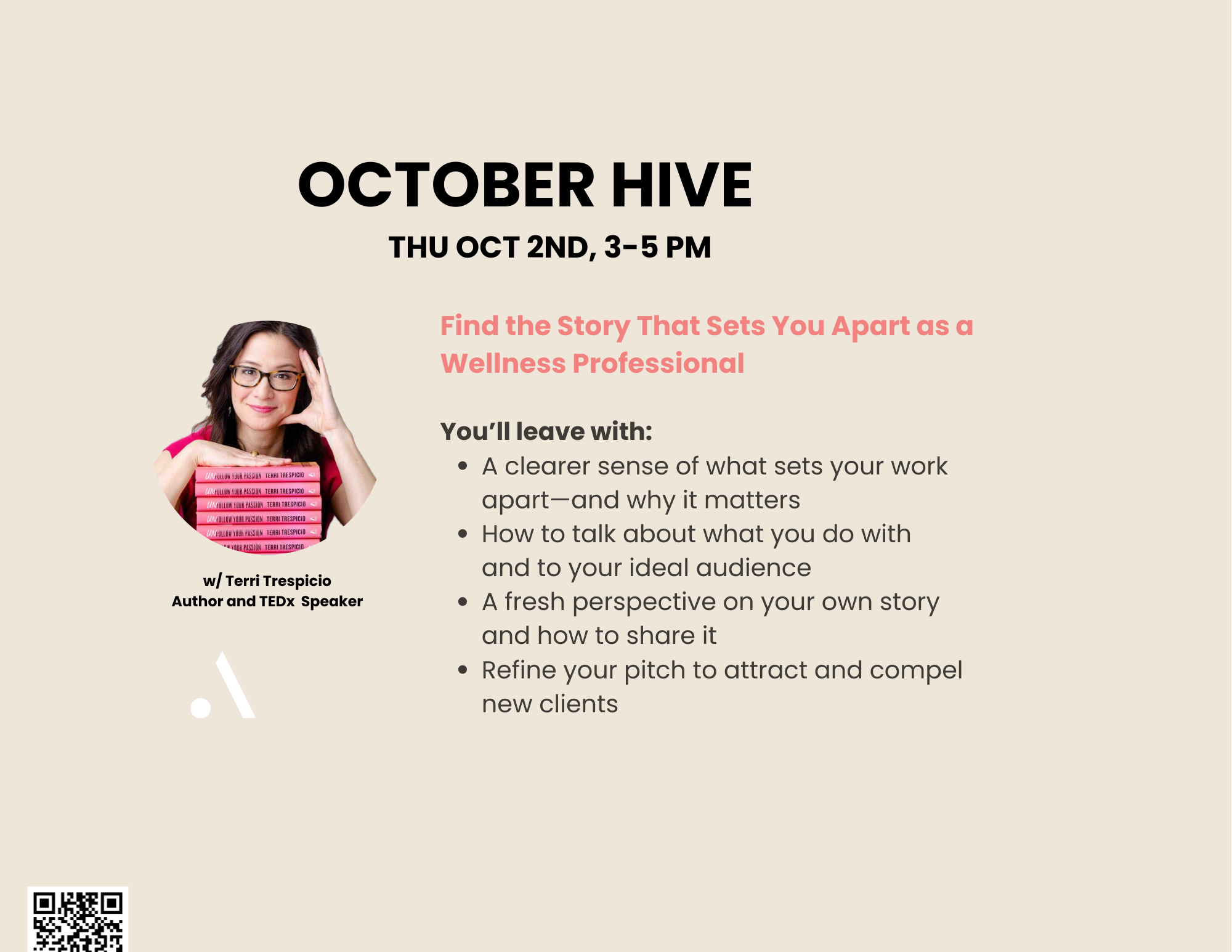 Our monthly event to connect, chat, and snack with other wellness pros, this month will be especially great. There will be A guided, interactive workshop to help you share your work with more clarity, confidence, and ease with Terri Trespicio, author, TEDx speaker, brand advisor, and expert creative copywriter.