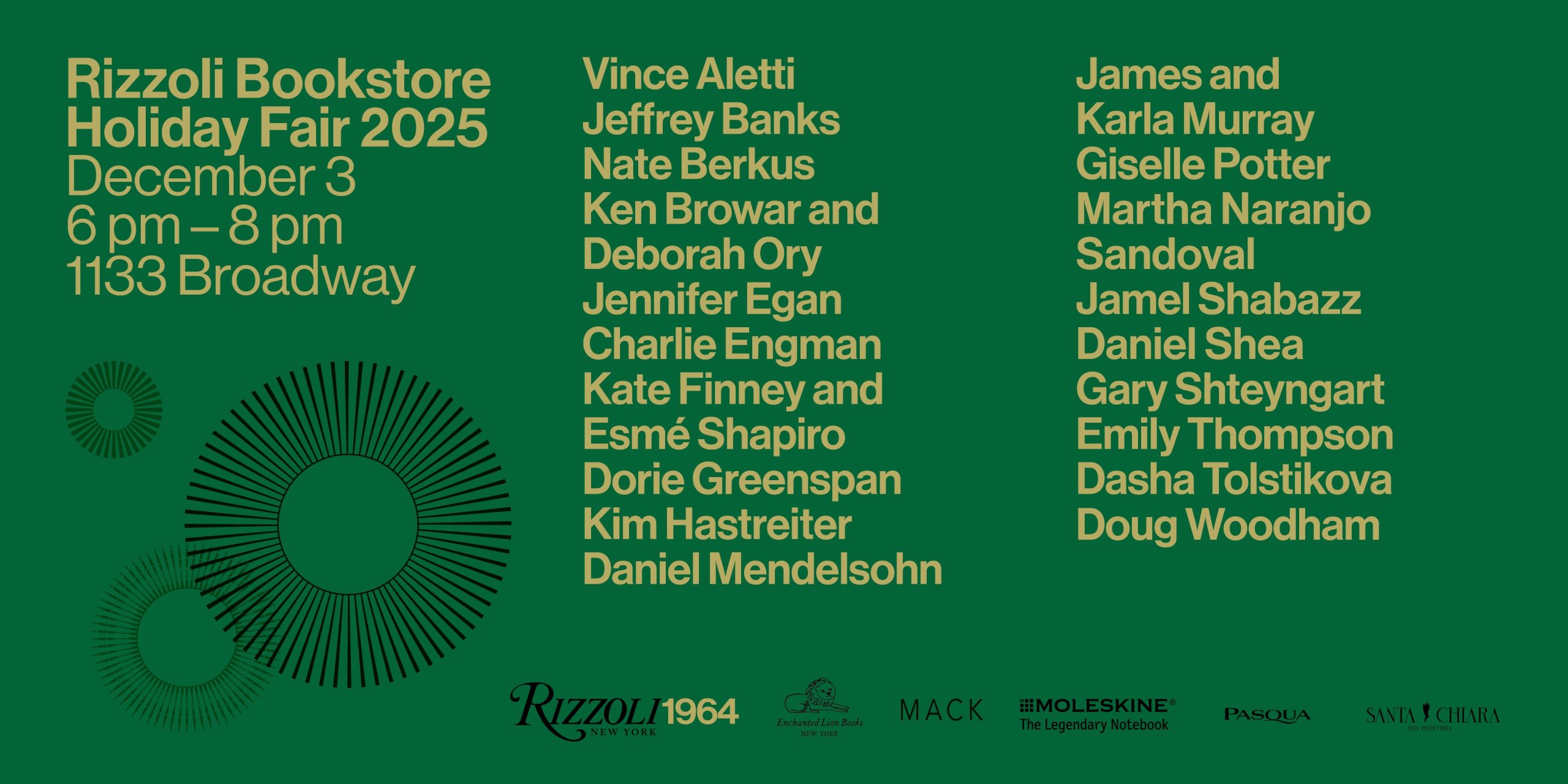 Meet a dazzling set of artists, designers, and writers, bring home signed editions to collect and give, enjoy Prosecco and Italian sweets, and help us toast a new year as a quintessential New York bookstore.