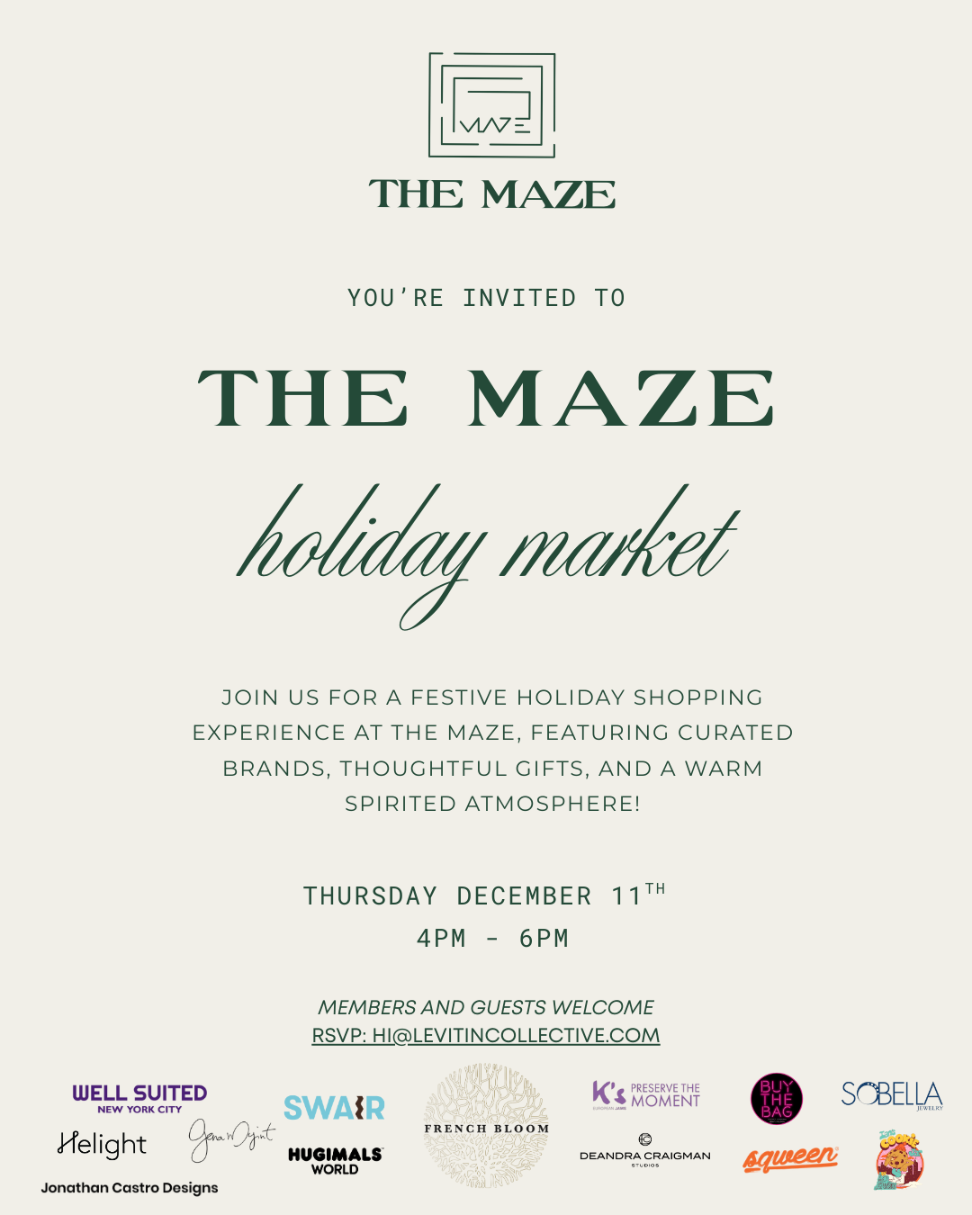 You’re invited to join The Maze, NYC’s first alcohol-free members club, for a Holiday Market on Thursday, December 11th from 4 to 6PM at 43 W 24th Street.