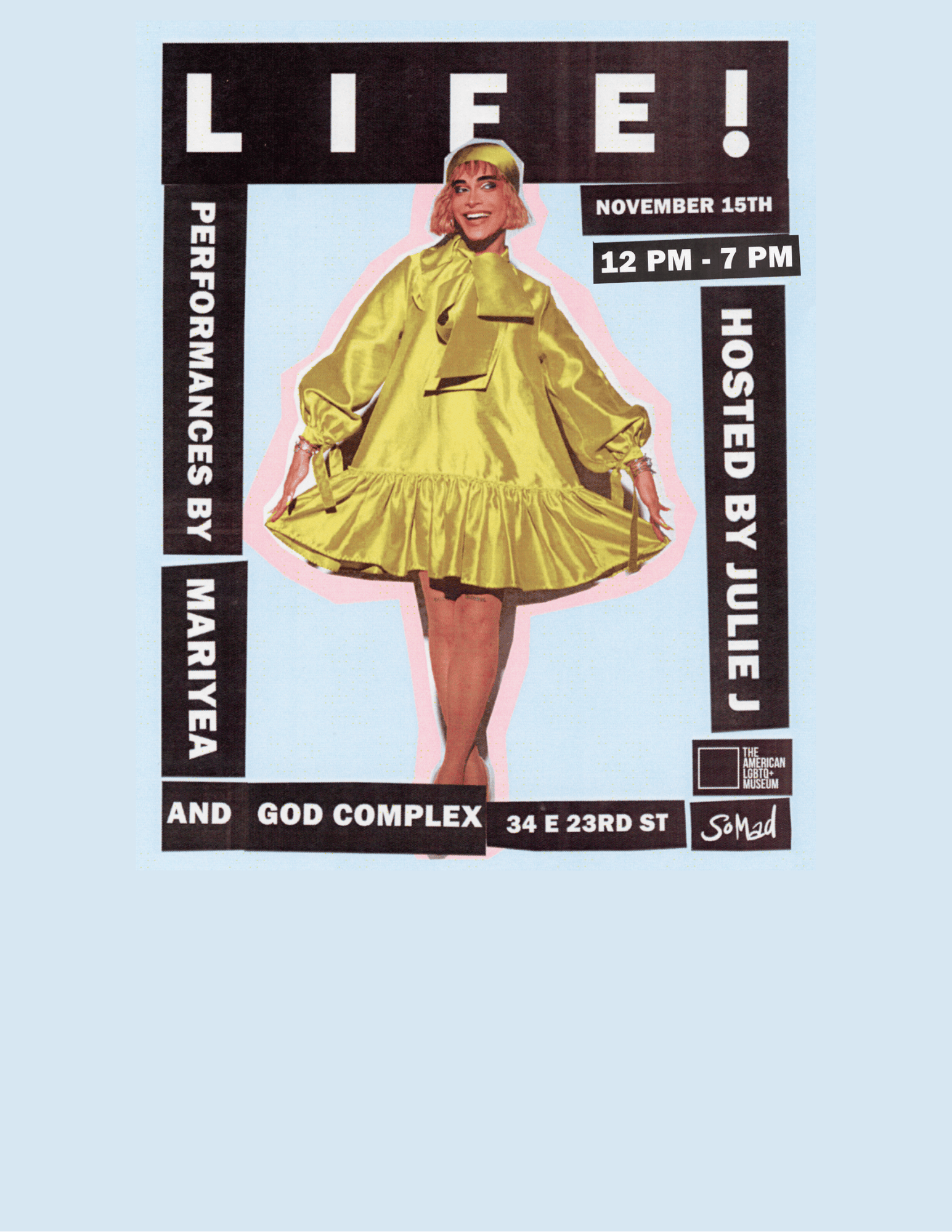 SoMad, Life is Drag curated by Rachel Rampleman, and artist Julie J present LIFE!, a collaborative event celebrating Trans Awareness Week on November 15th. Join us as we celebrate the voices and works of trans artists from all walks of life with a full day of programming.