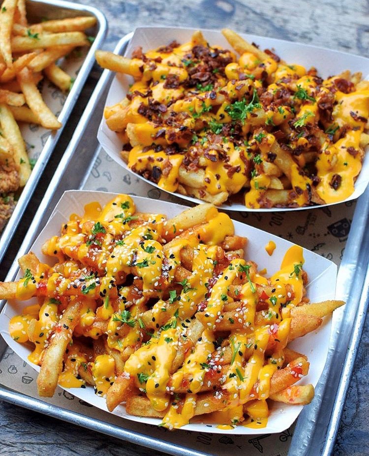 A number of Signature Creations dress up the chicken with sauces, toppings, and garnishes such as the Thai Fiesta including Mac sauce, Thai sweet chili, taco seasonings, and sesame seeds, and the Salted Caramel Pretzel made with caramel, pretzel salt, and fried pretzel bits. Expect a spin on some classic flavors as well like buffalo, honey bbq, and general tso. The baskets of fries are worth a trip too. Along with classic fries, there’s cajun, bacon mac, truffle parm, and S’mores (fries dressed with marshmallow sauce, chocolate sauce, crushed graham crackers, and mini marshmallows.)