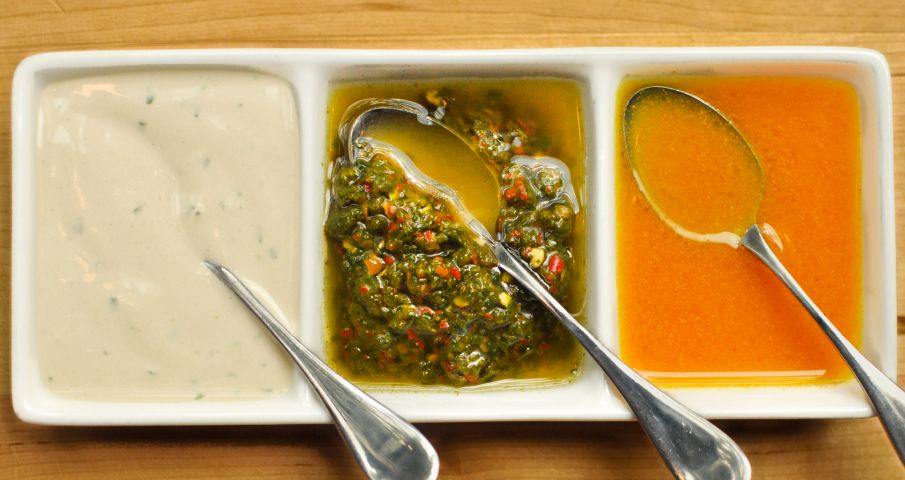 Looking for a new way to spice up your quarantine cooking? Taïm, a vegetarian, falafel joint and neighborhood favorite, serves a Yemenite Cilantro Hot Sauce called S’rug that people can’t seem to get enough of (pictured above: the center, green sauce). When placing an order, S’rug is a popular add-on to Taïm’s pitas, platters, and salads.