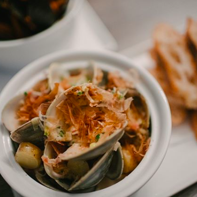 (Pictured: The ‘Chowder’ Steamed Clams with Bacon, Potato, and Bonito Cream)