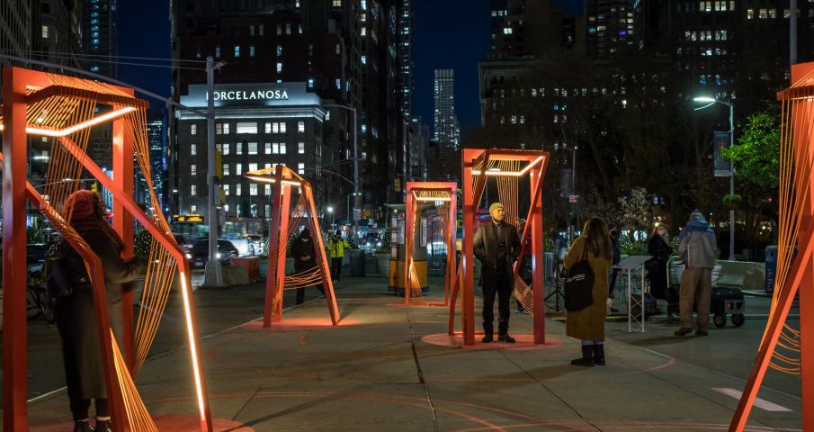 - The Flatiron/23rd Street Partnership unveiled “Point of Action,” a public art installation by Studio Cooke John. Located on the Flatiron Public Plaza, the installation asks people to step inside circles under the metal frame, putting people in the spotlight and encouraging them to safely connect with those around them. The installation is an element of the Partnership’s “23 Days of Flatiron Cheer” (via 6sqft, amNewYork, Arch Paper, NBC New York, Women’s Wear Daily, & Untapped Cities).