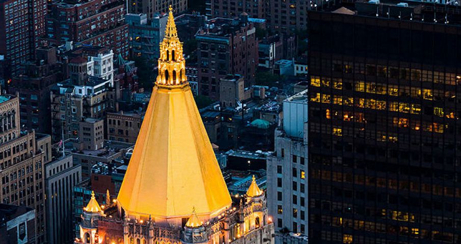 The 40-story, Gothic Revival-style New York Life Building was designed by Cass Gilbert, who also designed New York’s Woolworth Building and the U.S. Supreme Court Building in Washington, D.C. The limestone “Cathedral of Insurance” opened for business in November 1928 and was added to the National Register of Historic Places as a National Historic Landmark in 1978 and designated a historic landmark by New York City’s Landmarks Preservation Commission in 2000. It contains nearly 1 million square feet of working space, 38 elevators, 2,200 windows, and 72 gargoyles. The iconic gold pyramidical dome is made with gold-dipped ceramic tiles.