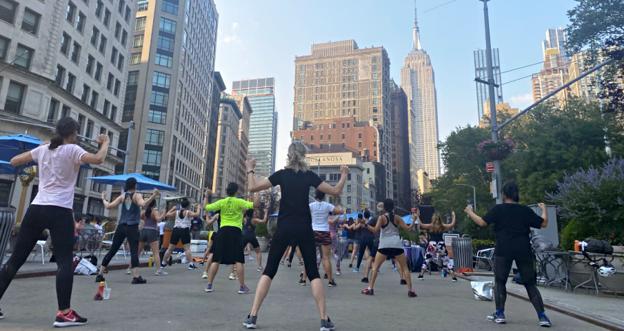The Flatiron/23rd Street Partnership’s Flatiron Fitness Series, which concluded on August 4th, presented eight weeks of outdoor workouts in support of local fitness studios and gyms. Attendees worked out on rooftop terraces at nearby hotels Tuesday mornings and at Flatiron’s signature “Wellness Wednesday” evening classes on the Public Plaza at 6 pm. All classes collected donations and 100% of donations were directed to fitness studio and gym partners. In total, we partnered with 10 studios and gyms, two hotels, and eight food and retail shops.
