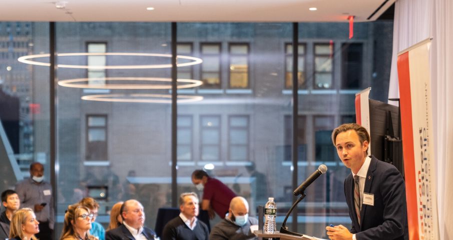 The Flatiron/23rd Street Partnership held its 15th Annual Meeting & Community Reception on Tuesday, November 9 on the rooftop terrace at Cure (345 Park Avenue South), Deerfield Management’s new healthcare innovation campus. With the theme “Moving Forward,” the meeting showcased the Partnership’s work to sustain Flatiron and NoMad’s vitality through the pandemic and beyond. The occasion marked the Partnership’s first in-person annual meeting since 2019, following last year’s virtual event.