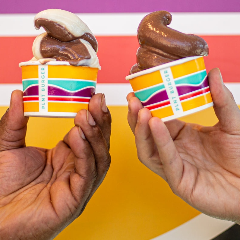 Square off your meal with an oat milk-based Soft Serve featuring seasonal, chocolate, or swirl flavors or try the Oatasty Shake made with strawberry, chocolate, or swirl flavors.