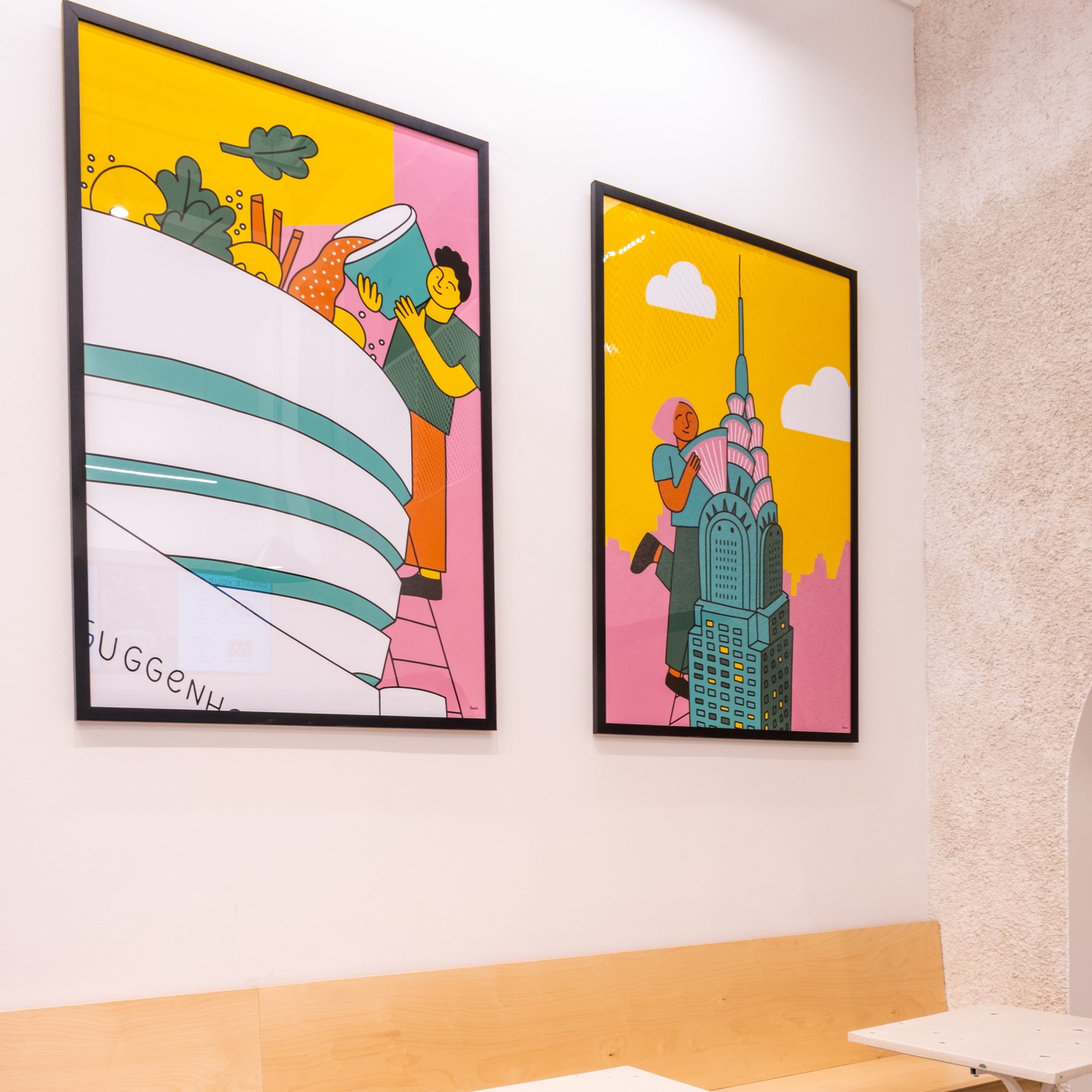 Since opening their first location in 2017 in Sunset Park, Brooklyn, Avocaderia has expanded with locations in Chelsea, Midtown East, and now NoMad. Upon entering the NoMad flagship, artwork by Italian designer Claudia Bessi is featured on the walls of the light-filled interior. Each piece pays tribute to New York, incorporating the city’s architecture in playful and surprising ways.