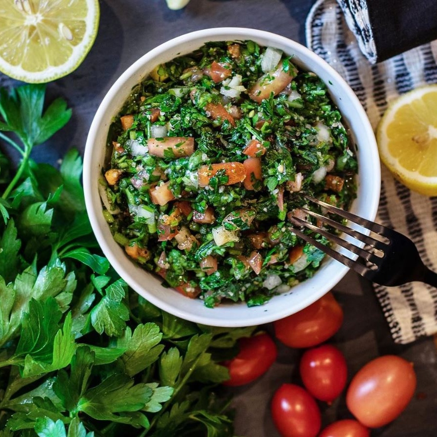 Pair your main with a couple hot or cold appetizers such as Little Tabboule made with parsley, mint, bulgur, tomato, onion, lemon, and virgin olive oil and Grape Leaves filled with parsley, rice, onion, and tomato. For a hot starter try Kibbe, fried beef dumplings stuffed with minced beef and pine nuts or Sambousik Jebne, a pastry filled with halloumi cheese and oregano.
