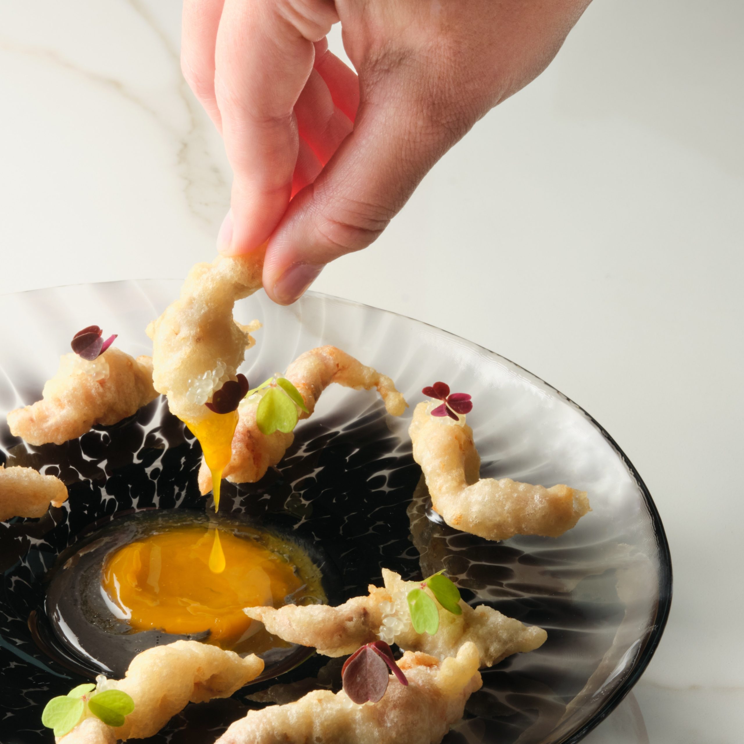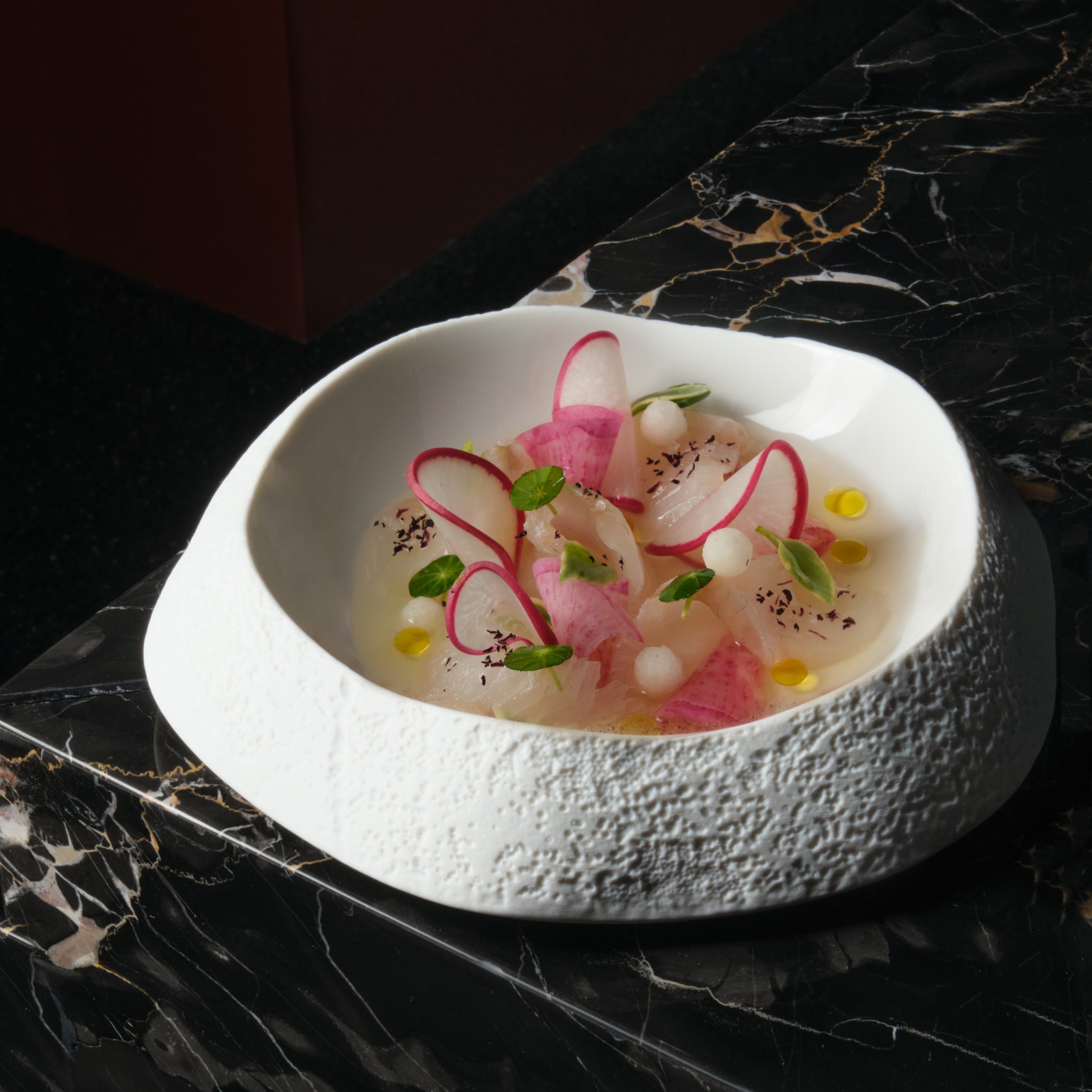 Upon entering the restaurant, guests are met by a warm and theatrical ambiance with natural wood throughout. Designed by Lázaro Rosa-Violán Studio, guests first enter The Bazaar Bar before heading upstairs to the dining room that takes inspiration from Hasekura’s travels. The restaurant includes a tapas bar with Spanish custom millwork and fabric-backlit spheres reminiscent of Japanese lanterns with Andalusian fringe. A unique detail of The Bazaar is a mixology bar offering a reinterpretation of Castilian bookshelves with amber glass, mirrors, and a brass bottle display built on top of a custom service bar – only the second of its kind in the country. The sophisticated design sets the stage for welcoming and inventive menus.