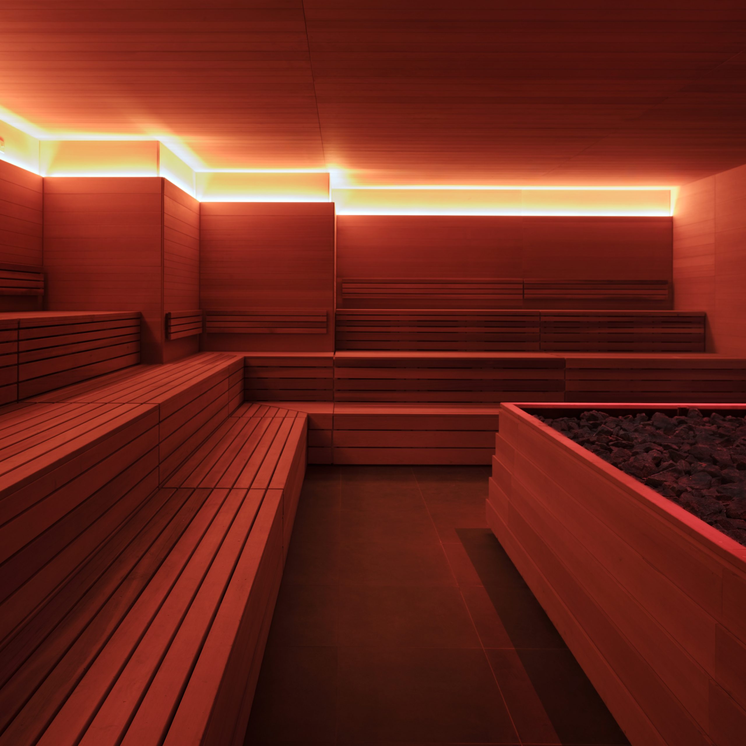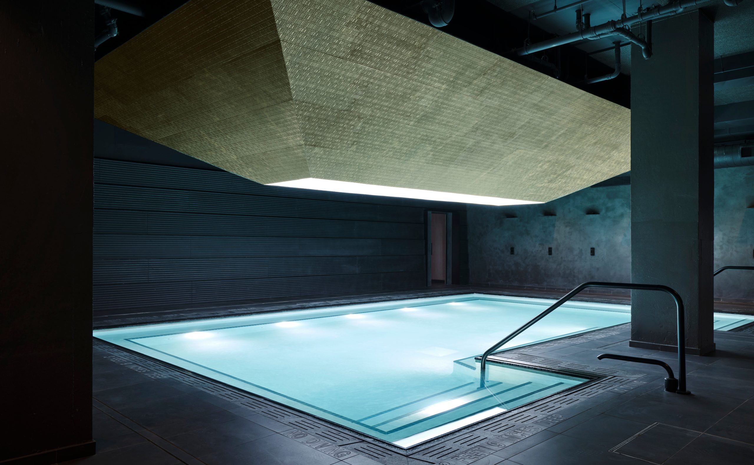 Upon entering the Bathhouse Flatiron lobby, guests are met by a transformative design. At 35,000 square feet, the space was converted from an underground parking garage into a contemporary bathhouse featuring a variety of amenities. Day pass guests can use six pools: 2 cold plunges, 2 hot pools, 1 neutral pool and 1 salt pool as well as three saunas and a steam room. The dry sauna is 800 square feet and can seat nearly 100 people, while the Russian-style Banya features variegated slate quarried in Vermont.