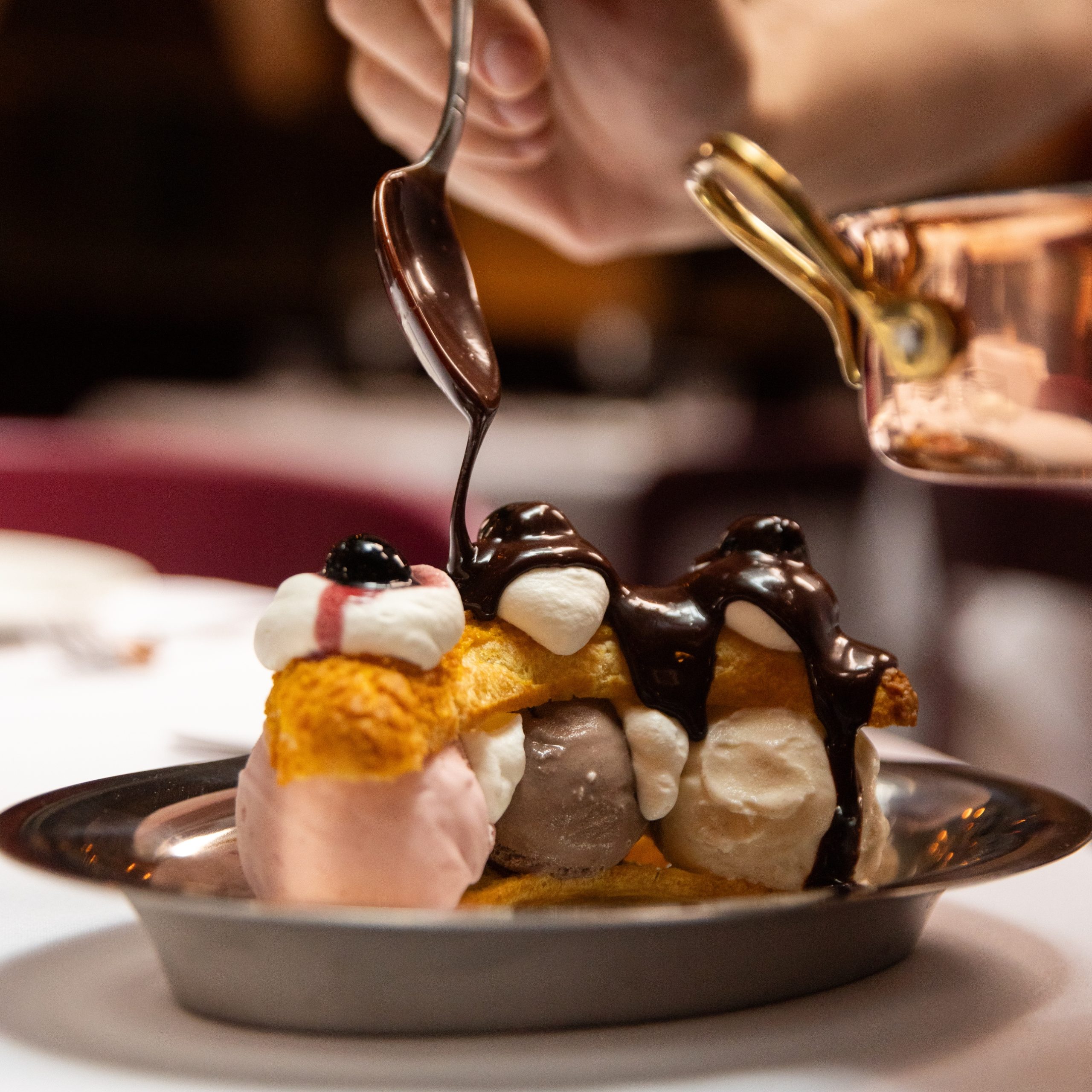 Diners can enjoy a unique menu that combines tradition and creativity from Chef Partners Jeremiah Stone and Fabian von Hauske Valtierra. Start your meal with an hors d’oeuvre like the Moules Frites, marinated mussels with chickpea frites or a Crab & Maitake Tartlet with black truffle and scarlet crab. Notable entrees include the Montauk Ruby Red Prawn Tartare with fried garlic, yuzu kosho, and crispy potato and the Golden Chicken Roulade for Two. Save room for dessert and indulge in a Banana Spliterole.
