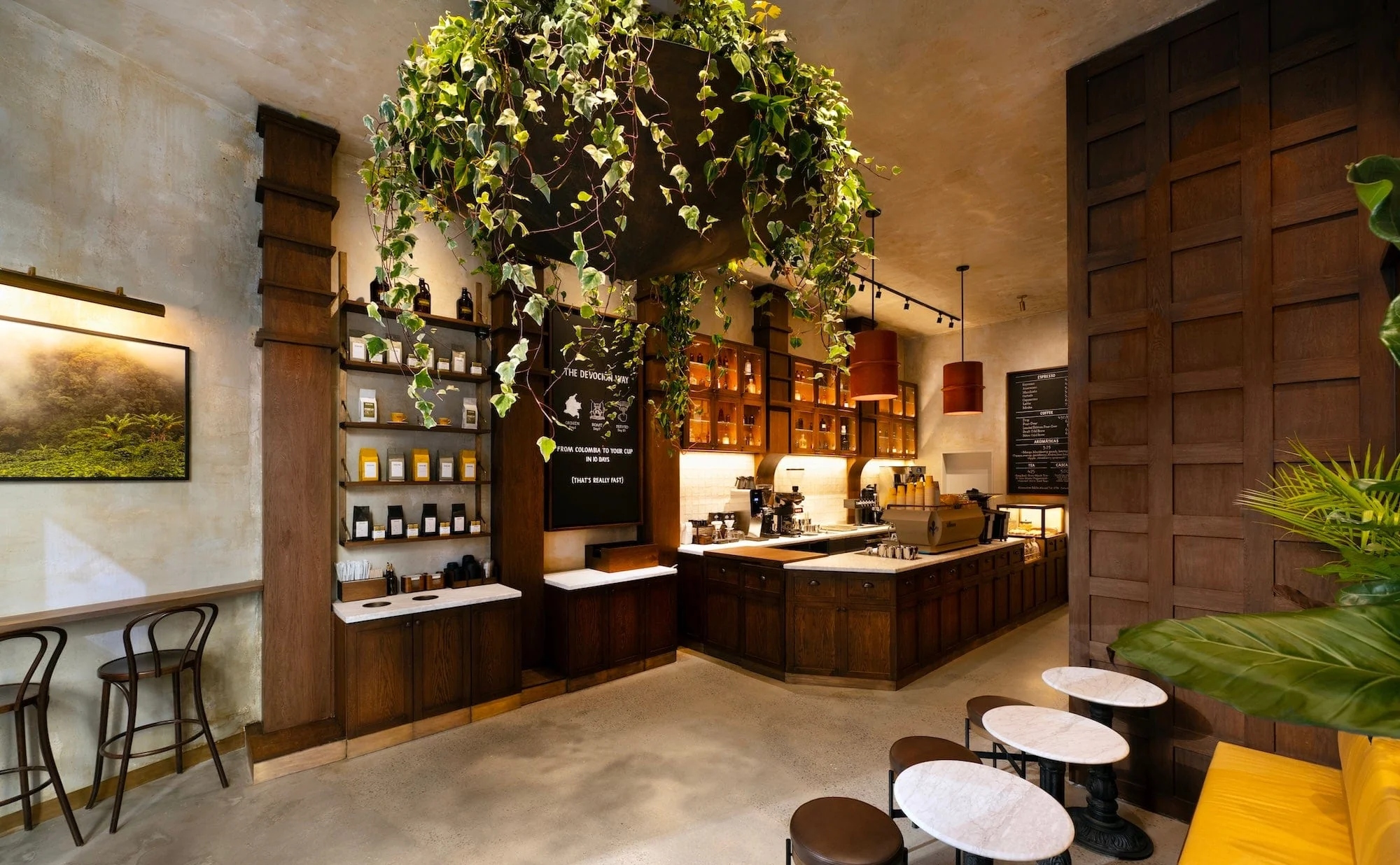 The New York-based Colombian coffee roaster Devoción has opened their newest location in NoMad. “When we entered the New York market ten years ago, I had a vision to deliver the freshest coffee available, transporting our customers to origin with a single cup,” says Devoción founder Steven Sutton. “Now, with our sixth café in NYC, we remain dedicated to this principle, transforming even more New Yorkers’ coffee experiences as we expand across the city.” Upon entering Devoción, guests are met by a welcoming atmosphere amidst a design that pays tribute to Colombia’s landscapes. Elements of natural wood, concrete, Carrara marble, and washed paint are present throughout the space that is deeply connected to Devoción’s roots. A signature feature is the chandelier planter which brings lush vegetation into the design and emphasizes Devoción’s commitment to the philosophy that architecture and landscape exist in harmony.