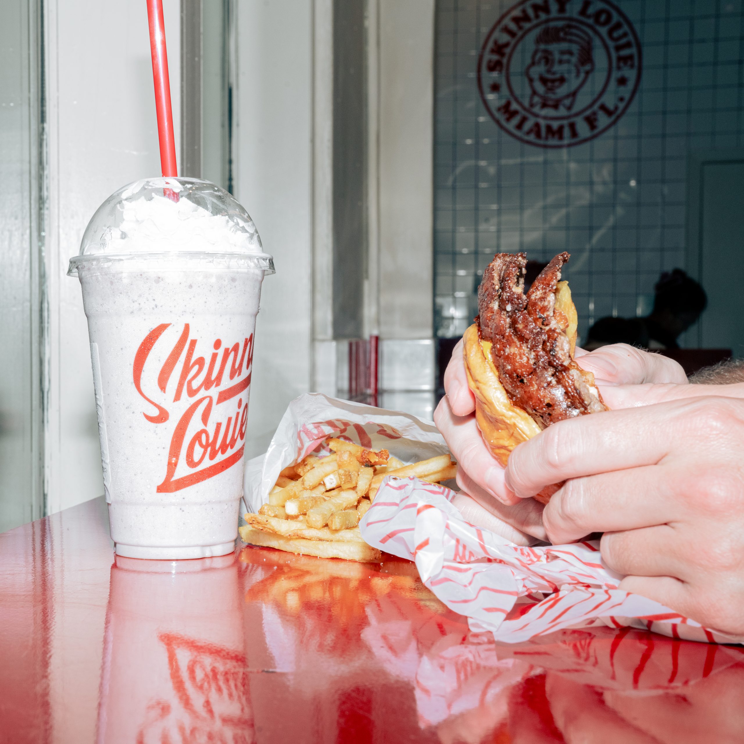 Skinny Louie’s menu is refreshingly simple with just three burgers, three milkshakes, and fries. Choose from the Skinny Louie Cheeseburger featuring grilled onions, double American cheese, pickles & Louie sauce, the Classic Burger with American cheese, tomato, lettuce, onions, ketchup & mustard, or the Applewood Bacon Burger topped with crispy Applewood smoked bacon, American cheese and Louie sauce. Pair your mouthwatering smash burger with fries and milkshake in flavors Cookies n’ Cream, Choco Brownie, or Strawberry Bliss. Stop by Skinny Louie for your next lunch, dinner, or late-night bite! Skinny Louie is open Sunday – Thursday from 11 am – 2 am and Friday – Saturday from 11 am – 4 am.