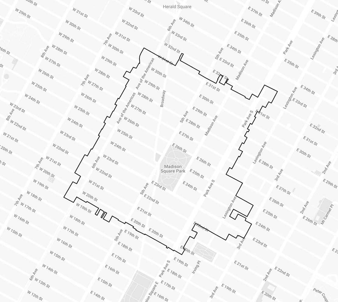 The Flatiron NoMad Partnership Business Improvement District (BID) services the area roughly defined as the south side of 20th Street to the north side of 31st Street, Sixth Avenue to Park Avenue South/Lexington Avenue.