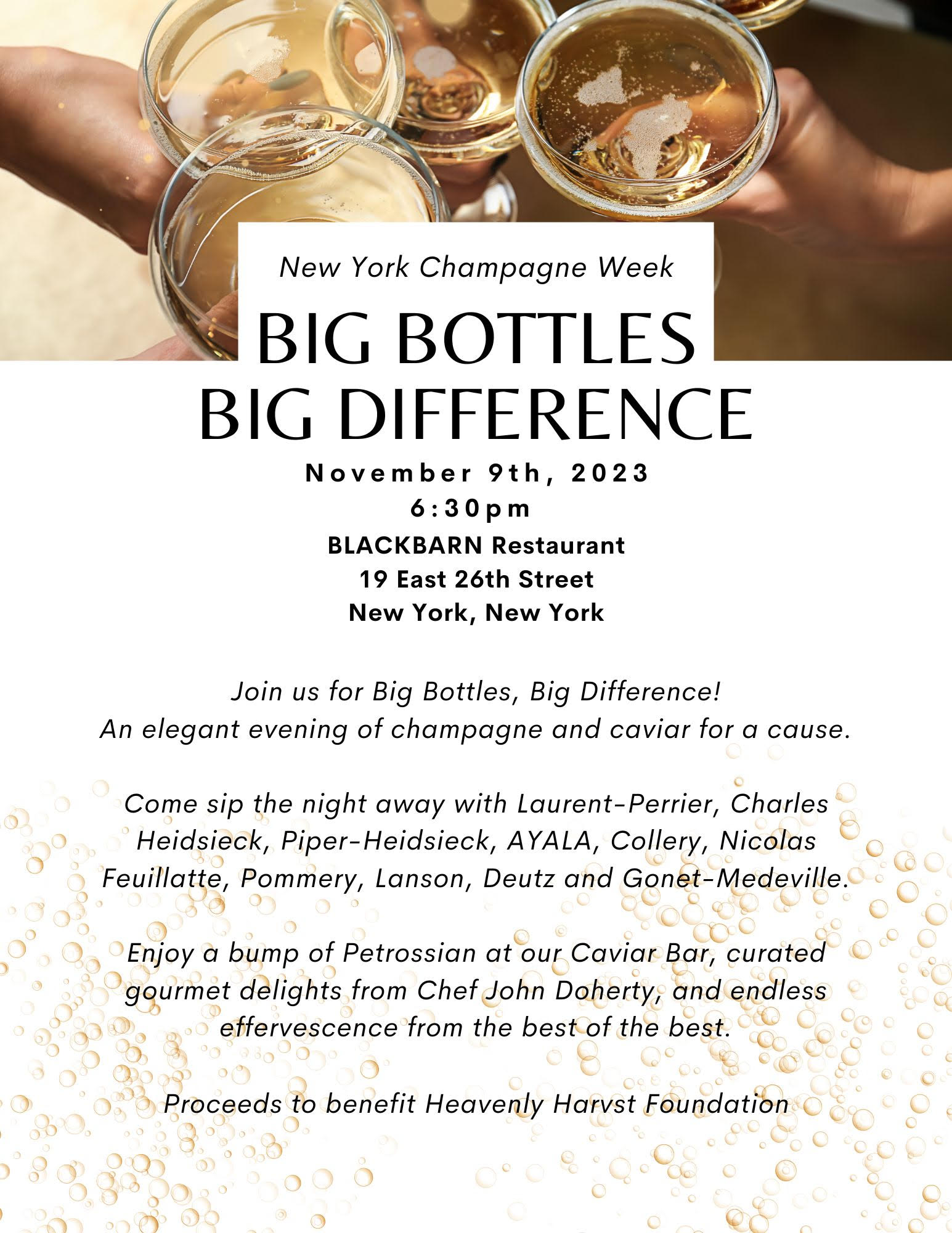 Featured champagnes: AYALA, Collery, Deutz, Charles Heidsieck, Gonet-Medeville, Lanson, Nicolas Feuillatte, Piper-Heidsieck, Pommery and to round out the 10 featured champagnes for this philanthropic forward event, we’re debuting a special NEW release reveal!