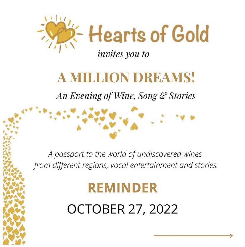 Join nonprofit Hearts of Gold on Thursday, October 27 for A Million Dreams Gala, an evening of wine, song and stories featuring Deborah Koenigsberger, Founder & CEO of Hearts of Gold, Maya Azucena, Singer / Songwriter, and Michael Green, Wine Curator.