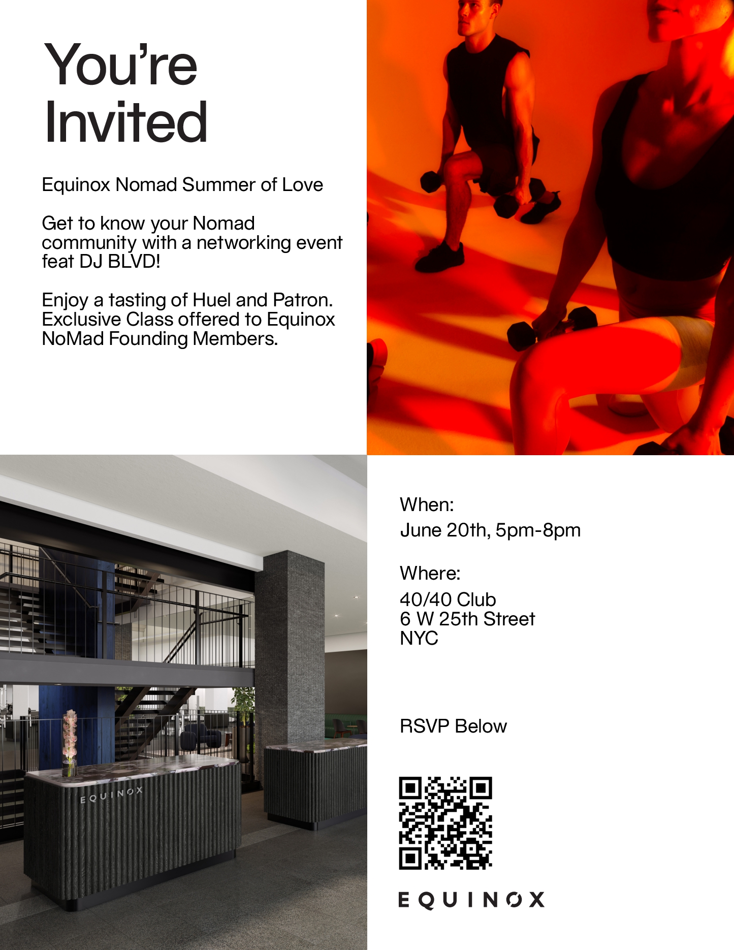 Get to know the community! Join Equinox NoMad for a complimentary networking event at 40/40 Club on Monday, June 20th from 5 - 8 pm. Enjoy a tasting of Huel…