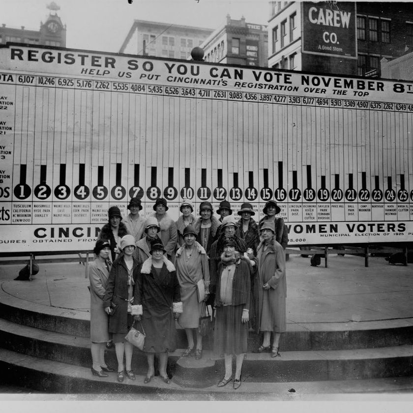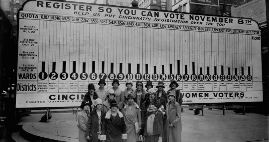A group from the Cincinnati chapter of the League of Women Voters stands in front of a board showing voter registration by city ward. (Photo by Library of Congress / Corbis / VCG via Getty Images)