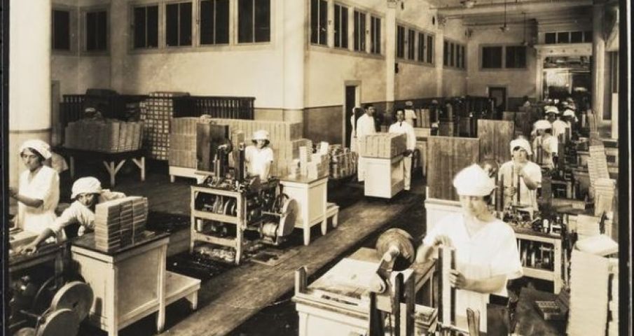 Soon after Hershey moved into the building, the company’s Sixth Avenue location was “whirring with the sound of boilers, mixers, candy presses, and wrapping machines, sending out five thousand boxes of chewing gum a day, and a lesser amount of other candy items,” notes Bowery Boys History. “Orders increased and production leapt to keep up with them,” writes the Hershey Community Archives. “More equipment was added and before long there were 24 wrapping machines. About a hundred people were working full time, ten-hour days and a half day on Saturday, a 54-hour week.”