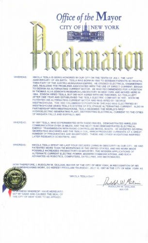 Then, 20 years later, a proclamation to declare July 10, 1997 as Nikola Tesla Day was issued by New York City Mayor Rudolph Giuliani on the 141st anniversary of Tesla’s birth. The decree read, in part, “Nikola Tesla spent his last four decades living in obscurity in our city. He had patented more 700 inventions in the United States, and his work made possible increased productivity in industry, the modern applications of alternate current electric power, modern communications, and such advances as robotics, computers, satellites, and microwaves.”