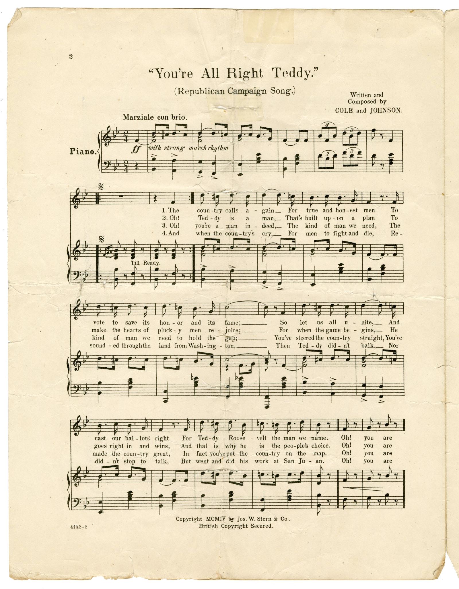 During this period, the 1904 presidential campaign was also underway. Johnson had been recruited to become chairman of the house committee for New York City’s newly formed Colored Republican Club on West 53rd Street. “The campaign to elect Theodore Roosevelt to succeed himself in the Presidency was just beginning to warm up,” wrote Johnson in his 1933 autobiography Along This Way. Roosevelt, a progressive Republican, was also a New York City native who had grown up in a brownstone located on East 20th Street. When asked by one of the club officials to “give us something good to sing” for Roosevelt’s campaign, the team of Cole and Johnson delivered “You’re All Right Teddy” within days, reported The Sun on July 31, 1904.