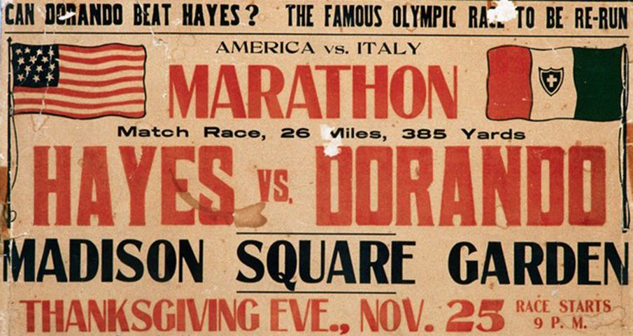 On Thanksgiving evening, November 25, 1908, Dorando Pietri, a confectioner from Carpi, Italy, and Johnny Hayes, an Irish-American who worked at Bloomingdale’s department store and trained on the store’s rooftop cinder track, raced at the Garden. Earlier that year, the pair had competed in the London Olympics and garnered global attention. The rematch was later described as “the most spectacular foot race that New York has ever witnessed” by The New York Times.