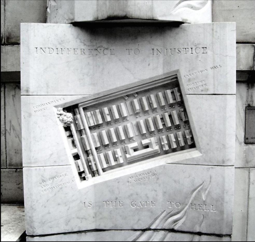 Upon its completion, the structure was shipped to New York City. The Department of Cultural Affairs Percent for Art Program describes Feigenbaum’s Holocaust memorial design as “a six-sided half column rising 27 feet above its base. The five-sided concave base extends one story below ground level, the overall height of the memorial being 38 feet. Carvings of flames along the length of the column recall the flames of the gas chambers at Auschwitz. They appear to blow in the direction of the courthouse as if to threaten the symbol of Justice. A relief of an aerial view of the main camp at Auschwitz is carved into the base at eye level. An inscription ‘Indifference to Injustice’ has been carved above the relief, ‘Is the Gate to Hell’ below it.”