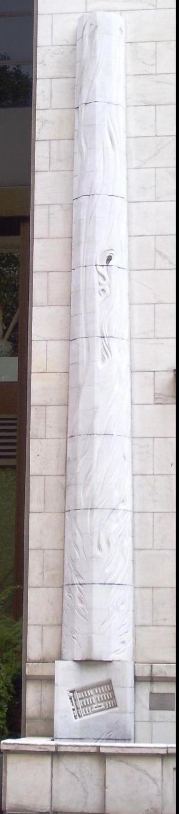 The marble obelisk-shaped sculpture, known as the Memorial to Victims of the Injustice of the Holocaust, is erected on an exterior wall of the annex at the Appellate Division Supreme Court of the State of New York on Madison Avenue and 25th Street. Created by artist Harriet Feigenbaum, the monument was the first of its kind to appear on a U.S. public building in 1990.