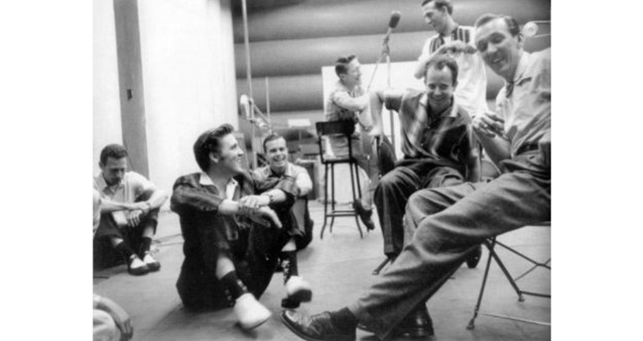 Header Photo: Hoyt Hawkins, Elvis, Neal Matthews, Scotty, Gordon Stoker, DJ and Hugh Jarrett in Studio A – July 2, 1956. Photo by Alfred Wertheimer.