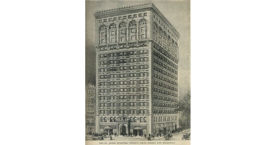 Prior to the construction of the St. James Building, the fashionable St. James Hotel occupied the 1133 Broadway since the mid-19th century. The hotel was the “resort of the better class of sporting men, especially those interested in the turf,” reported the King’s Handbook of New York in 1893. However with a new century on the horizon, and the increasing shift of hotels and residential homes to Midtown and beyond, the area grew into a predominantly commercial business locale.