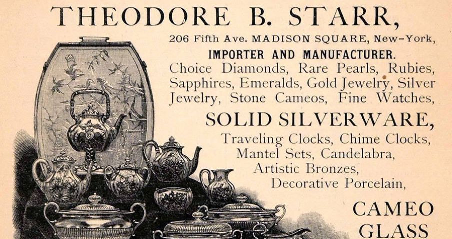 A decade after Dreicer’s arrival in the area, Theodore B. Starr, an acclaimed silversmith, jeweler, and Dreicer competitor, moved next door to the pearl aficionado. Starr’s store, however, shared two entranceways, 206 Fifth Avenue and 1126 Broadway, during its occupation in the neighborhood from 1877 until 1911.