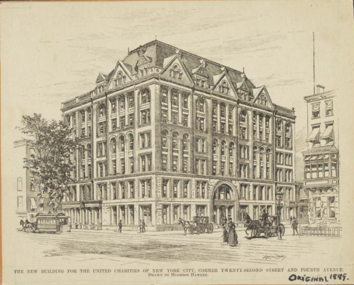 As we enter the 2019 holiday season of giving, the Flatiron Partnership offers a snapshot of the 1893 debut of the United Charities Building, a pioneer headquarters for a number of nonprofit organizations that provided social services to those in need. The Renaissance Revival-style building shared the address of 287 Fourth Avenue (now Park Avenue South) and 105 East 22nd Street.