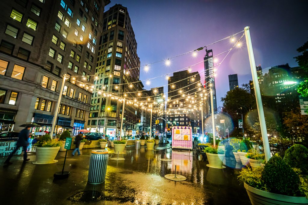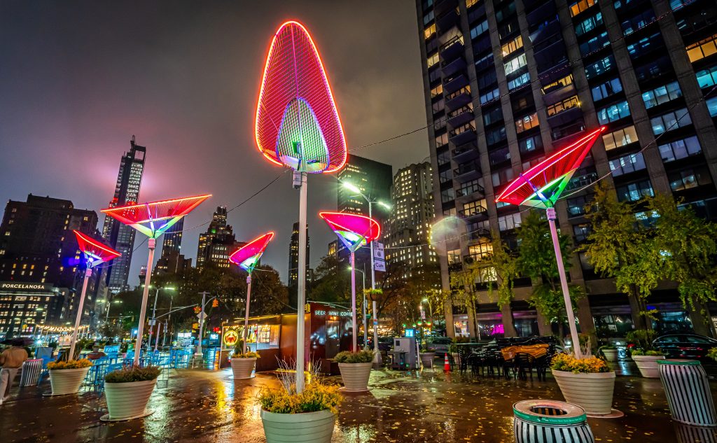 1. Your firm, Hou de Sousa, recently installed festive lighting to enliven the Flatiron Plazas after sunset. The Flatiron South Plaza, located next to the Flatiron Building, now features what we lovingly refer to as Tulips near the Flatiron Plate kiosk. Tell us more about the concept and inspiration behind the design of Tulips.