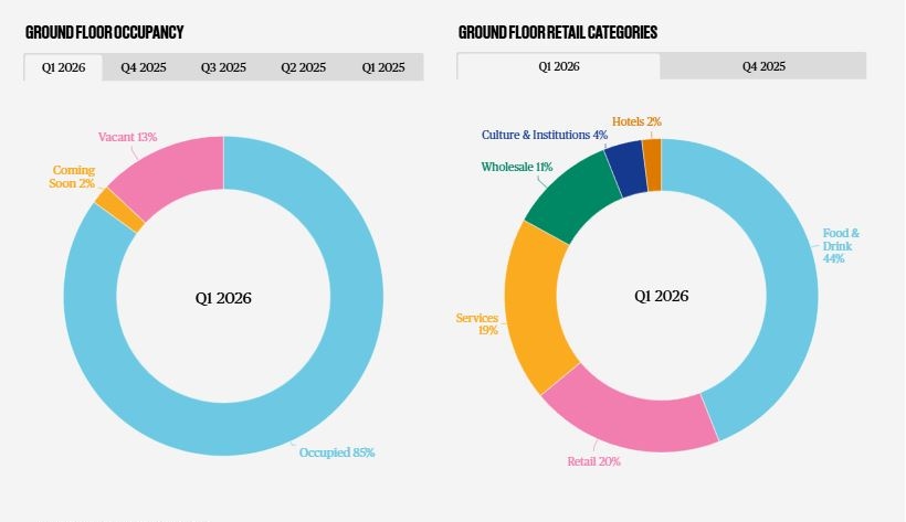 - 44% of ground floor retail is dedicated to food & beverage establishments