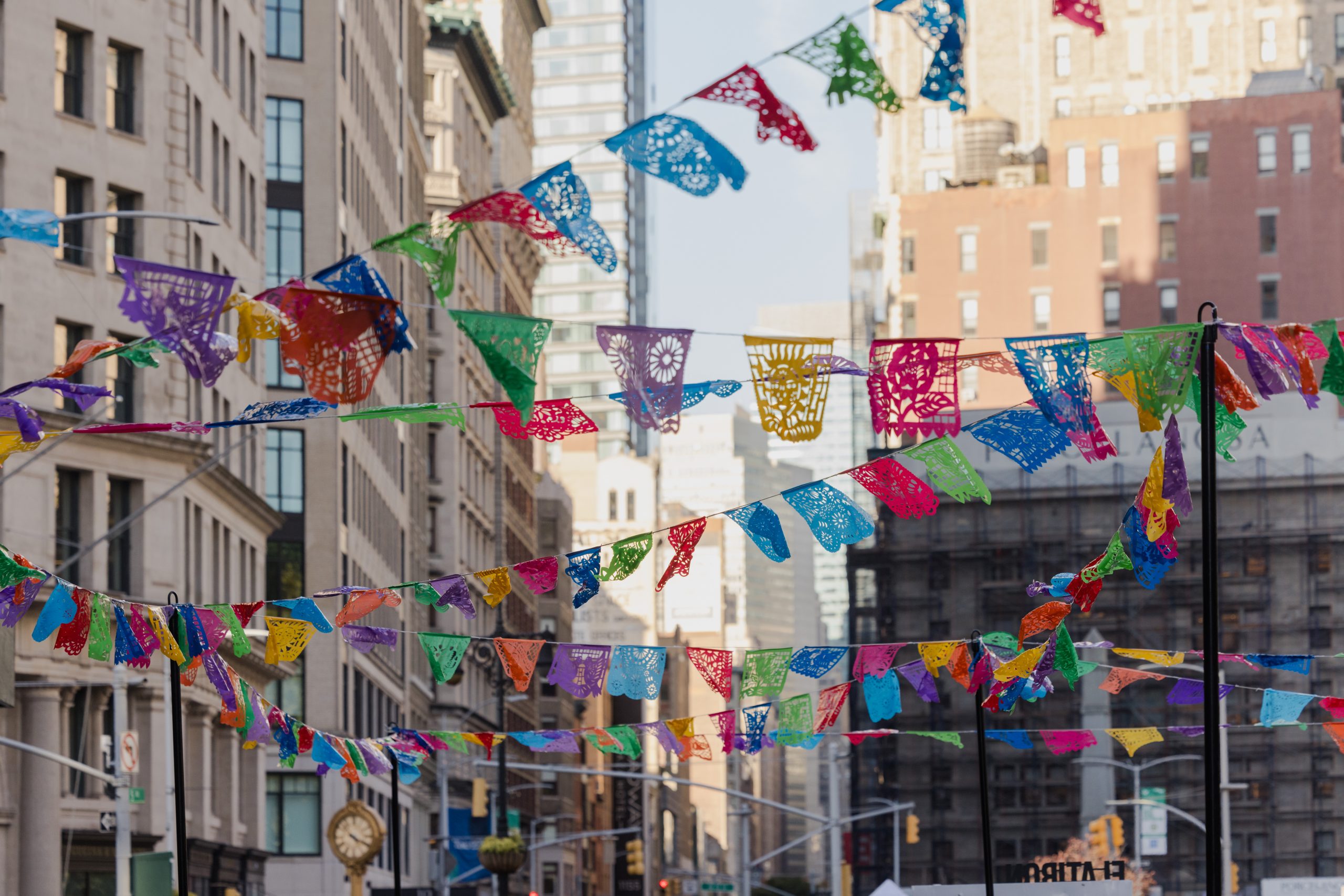 Estamos iluminando la Flatiron South Plaza con vibrante papel picado, instalado por la artista y diseñadora Tanya Aguiñiga.