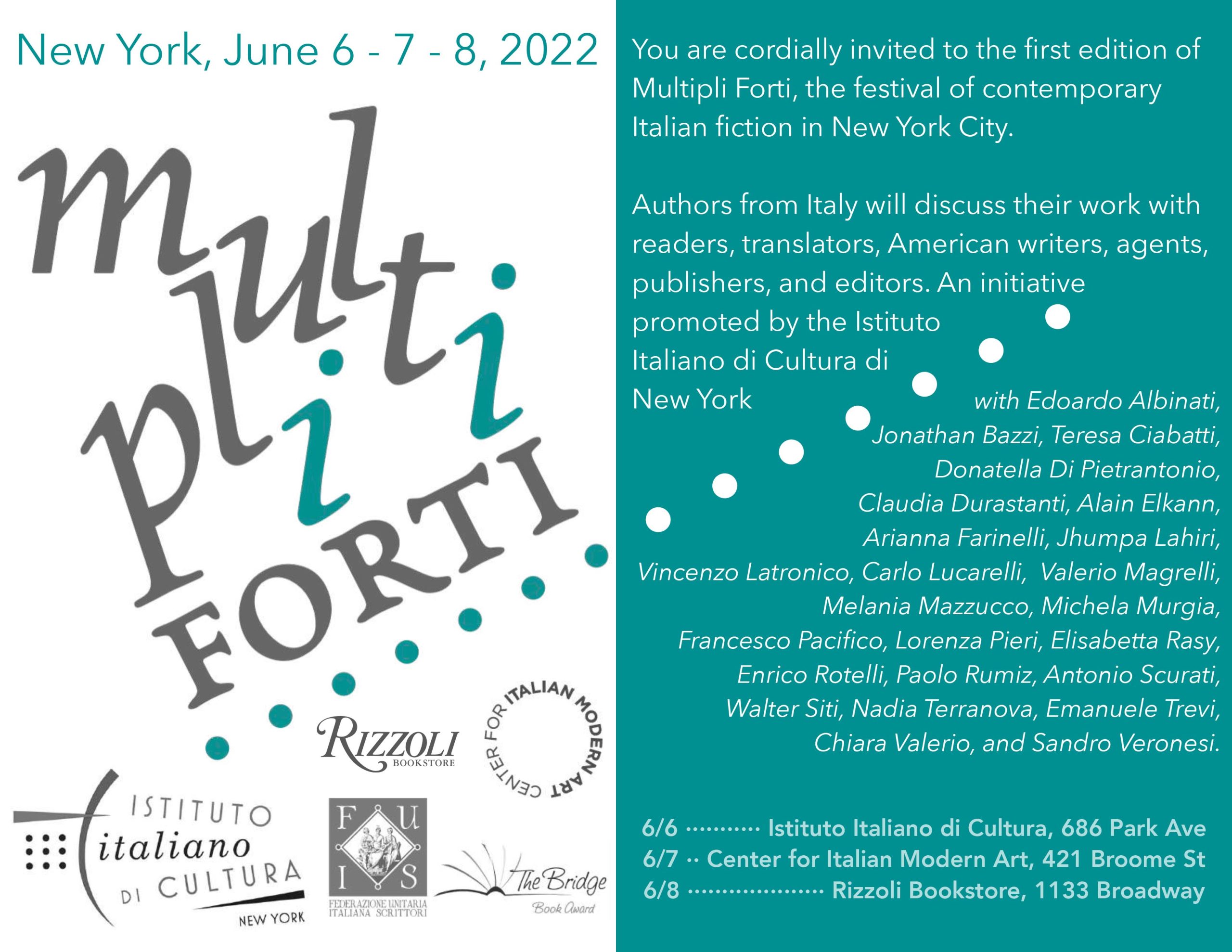 Rizzoli Bookstore 1133 Broadway, New York, New YorkJoin Rizzoli Bookstore on Wednesday, June 8th for Multipli Forti: Voices from Contemporary Italian Literature during the first edition of the Italian Literary Fiction Festival. Hear from a select group…